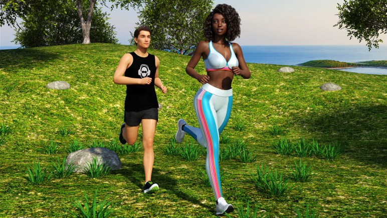 For today’s preview image, we can see that our resident health expert Jazmin is finally getting you, the MC, back into shape with an early morning workout.